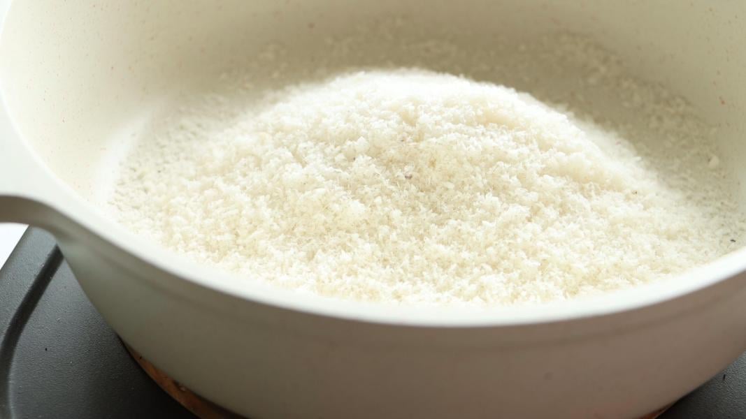 - Dry roast coconut in a heavy bottomed pan over a low-medium flame for about 2-3 minutes. No need to change the color.