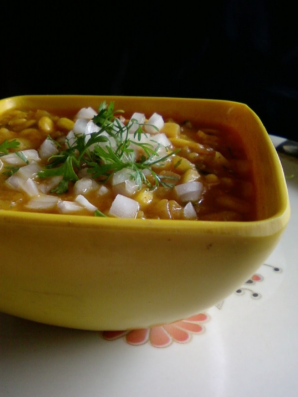 Method :Put the corn, salt and half cup of water in a pressure cooker. Cook till 3 or 4 whistles. Mash the boiled potatoes with fingers or masher and set aside. Chop the onion and tomato into small pieces and set aside. Wash, peel and grate the carrot and keep aside. Heat one table spoon of oil in a vessel and add the chopped onions. Fry for 2 minutes. Now add the boiled corn, mashed potato, tomato, carrot, salt,garam masala, turmeric powder, red chilli powder and 1 glass of water. Cook for 5 minutes. Now add the copped coriander and cook for another 2 minutes. Decorate with fresh coriander leaves and chopped onions. Serve hot.