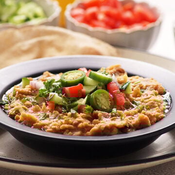 Egyptian fava beans taste best when freshly made and served warm. However, it can be stored in the refrigerator for up to 3 days. When reheating, add a small splash of water to loosen the texture and gently reheat on the stovetop. You can also reheat in the microwave.