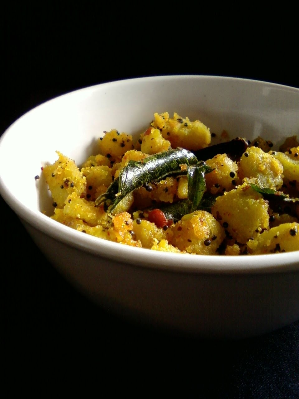 Wash, peel and chop the pumpkin into small pieces and set aside. Heat two teaspoons of oil in a vessel and add the mustard seeds,chana dal and urad dal and let them splutter. When the seeds stop popping, add the curry leaves and red chillies and fry for few seconds. Add the chopped pumpkin, turmeric, salt and little water and mix well. Cover with a lid and let it cook completely. When it's done, add the gram flour and red chilli powder and fry for two minutes. Turn off the flame and serve hot with steamed rice.