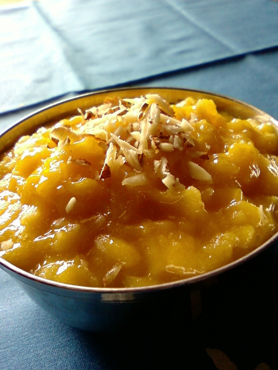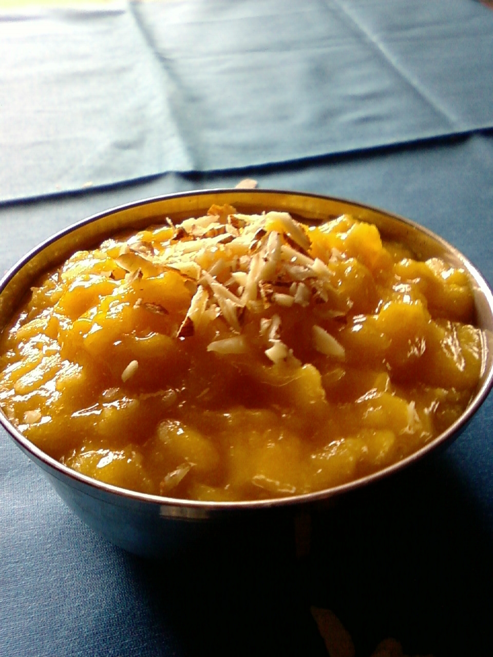 Method :Wash and drain the thick rice flakes and set aside. Blend the mango pieces, sugar and cardamom powder into a smooth puree. Combine the mango puree and soaked rice flakes and mix well. Set aside for 5 minutes and serve immediately or chill until ready to serve.Garnish with chopped almonds.