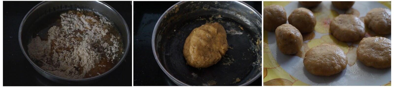 - Add the melted jaggery to the wheat flour mixture and make a soft dough. Sprinkle a little more water if it feels dry. Knead it to make a soft and smooth dough.