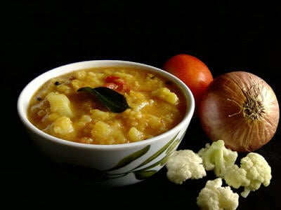 Put the toor dal, gobi florets, chopped tomato, chopped onion, tamarind, green chillies and 1.5 cups of water in a pressure cooker and cook till 3 whistles. Turn off the flame and wait until the pressure go off. Heat a teaspoon of oil in a vessel. Add the mustard seeds, chana dal, urad dal and let them splutter. Add the garlic cloves, red chilli and curry leaves to it and fry for a few seconds. Now add the gobi dal mixture, salt, red chilli powder and turmeric to it and cook for 2 minutes. Switch off the flame and serve hot with roti or steamed rice, dollop of ghee and some papads.
