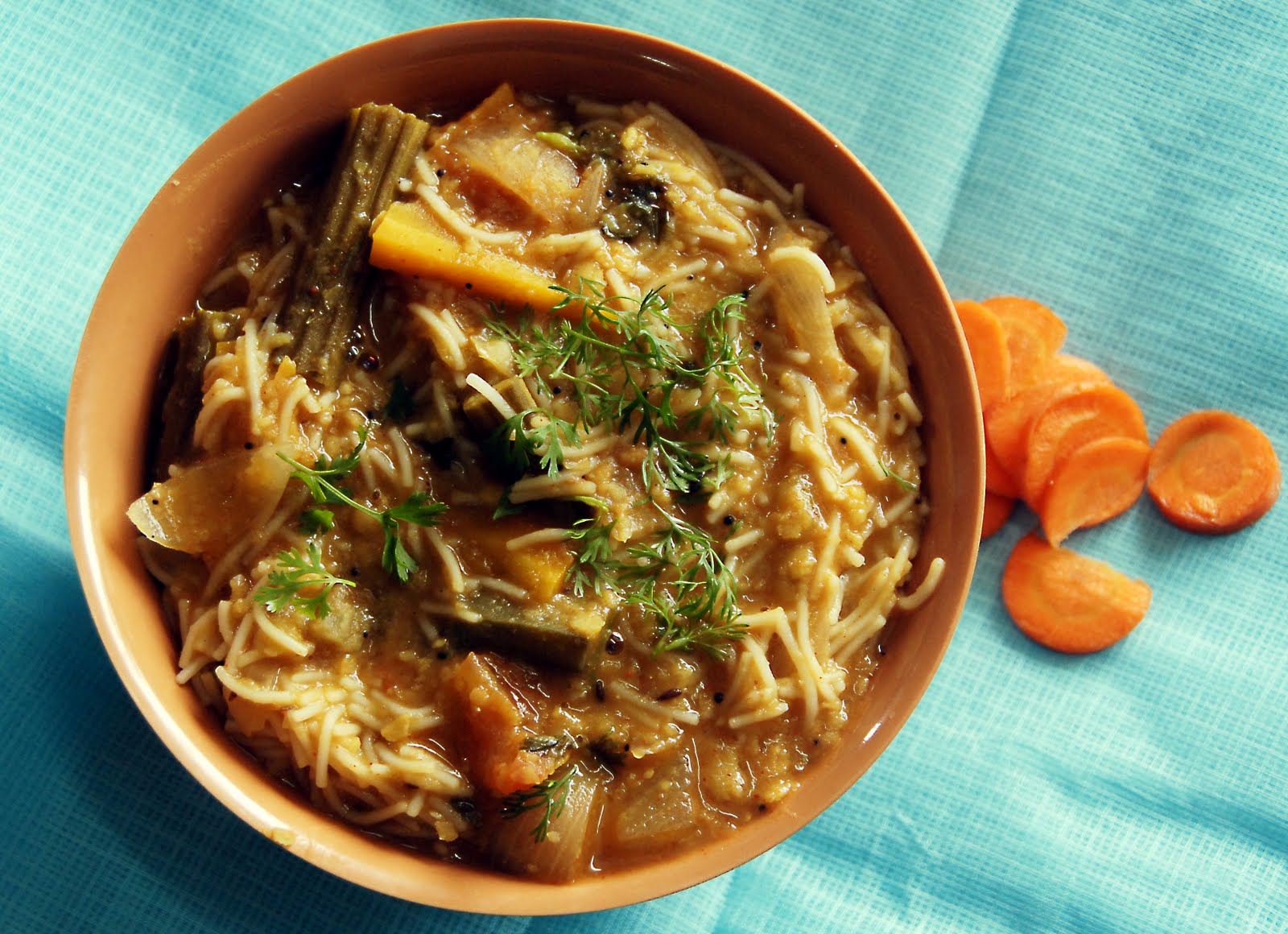 Bring water to boil. Add a teaspoon of oil and vermicelli. Cover and cook on medium flame for 2 to 3 minutes. When the vermicelli is cooked, strain and run cold water through it. Keep it aside. Wash and cook the toor dal in a pressure cooker for 3 whistles and set aside. Heat oil in a vessel and add the mustard seeds, cumin seeds. When they start to splutter, add the cloves, chopped green chillies, red chillies, hing, cinnamon stick and curry leaves to it and fry for a minute. Then add the all veggies and little water and mix well. Cover with a lid and let it cook completely. Now add the tamarind extract, sambar powder, salt, turmeric powder, red chilli powder, cooked toor dal and a cup of water to it and cook for 8 to 10 minutes. When it's done, add the boiled vermicelli and chopped fresh coriander leaves and mix well. Switch off the flame and serve hot.